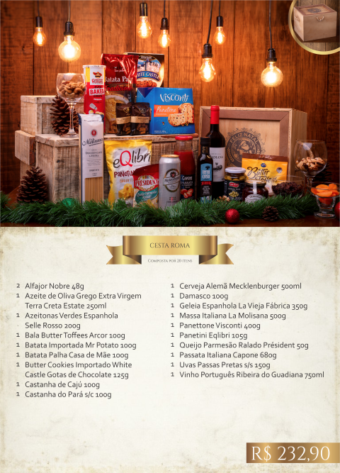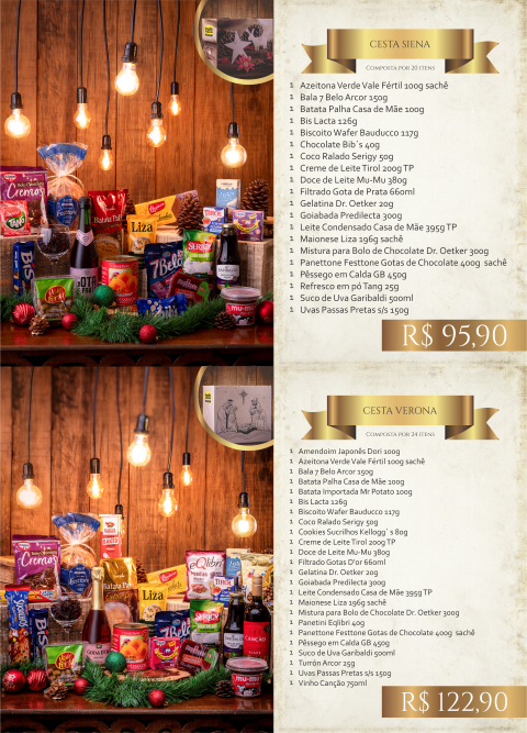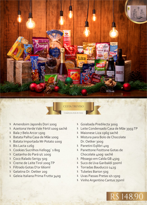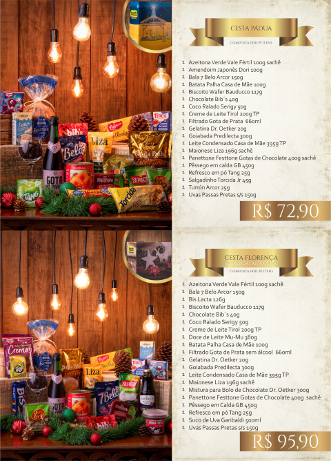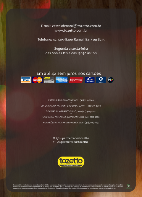 Aceitamos encomendas pelo telefone (42) 3219 – 8200 - Ramais 8217/8215 (horário comercial) ou pelo e-mail: cestasdenatal@tozetto.com.br